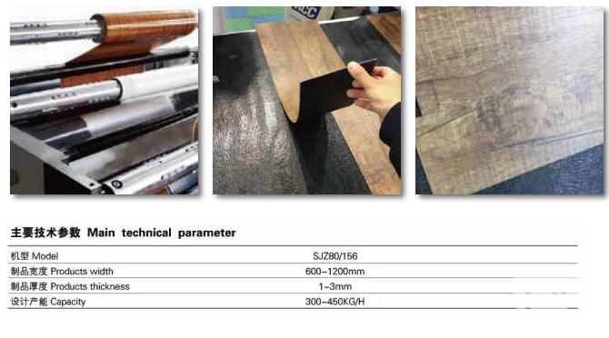 生產線由擠出機擠出地板基材,再經過一套六輥復合機對基材與印刷層,耐磨層,防滑層進行同時復合,通過對放卷張力,耐磨層預熱的精確控制,達到放卷時不起皺,不收縮,不變形等效果,擠出復合生產效率高,產品質量穩定。